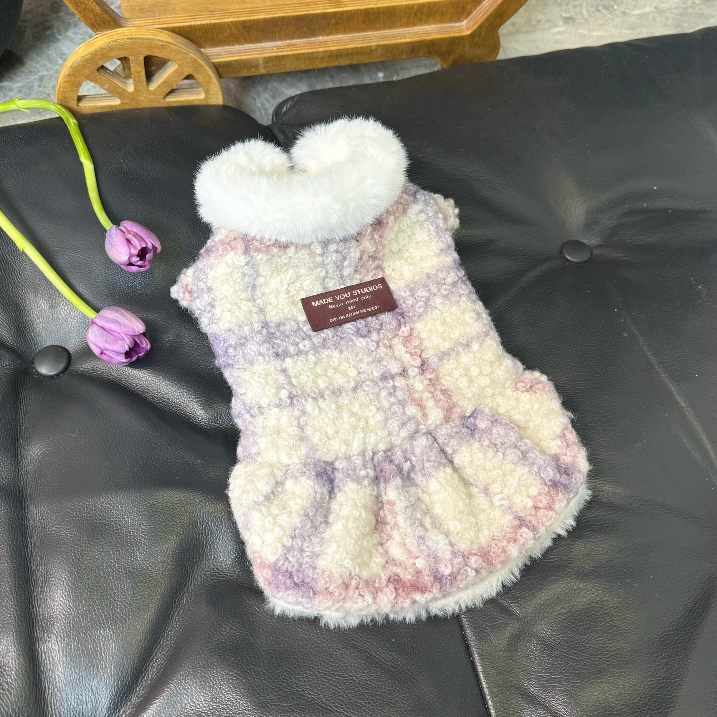 purple check fur coat