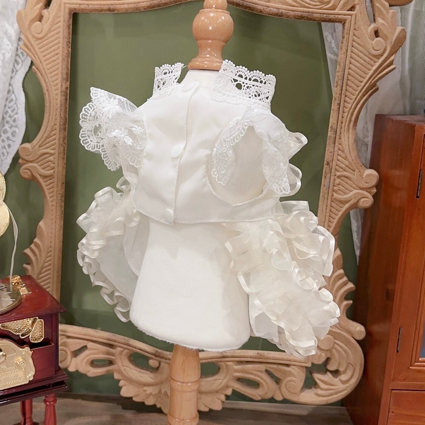 フリルレースのボリューム感はサイズが大きくなると生地の面積が広くなる為、レースとの感覚が空くため雰囲気が変わります。